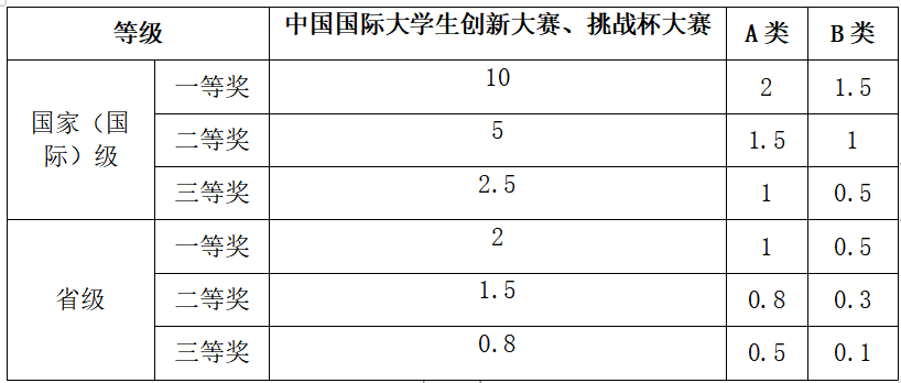 (2)依照《全国普通高校老员工竞赛目录》《悟空体育本科生学科竞赛管理办法》公布的竞赛,对参加学科竞赛获奖者认定分数,认定标准如下: