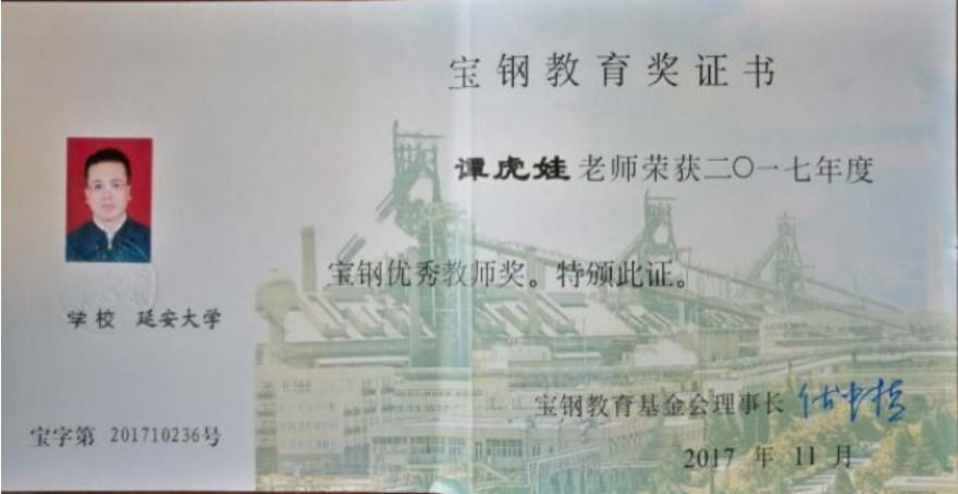 谭虎娃获“2017年度宝钢优秀教师奖”
