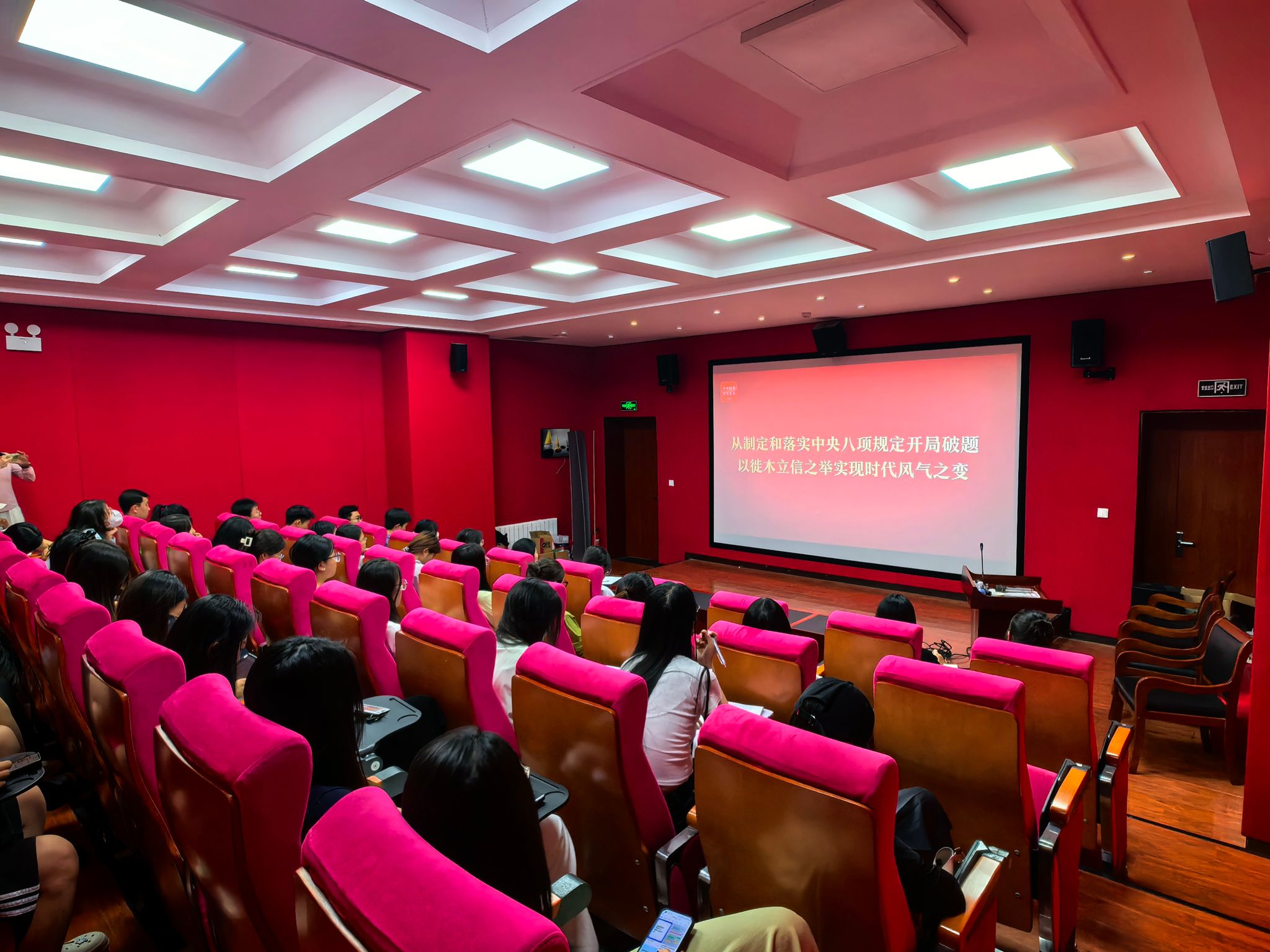 会上,研究生党支部委员曹文瑾带领全体党员及第66期入党积极分子进行中央八项规定精神专题学习。学习围绕中央八项规定精神出台的时代背景、核心内容,以及党员践行要求三个维度展开。同时还通过原文研读、案例剖析与交流研讨,让大家深刻领会精神内涵。通过此次学习强化纪律意识,激励师生将规定精神融入学习工作,永葆清正廉洁本色。