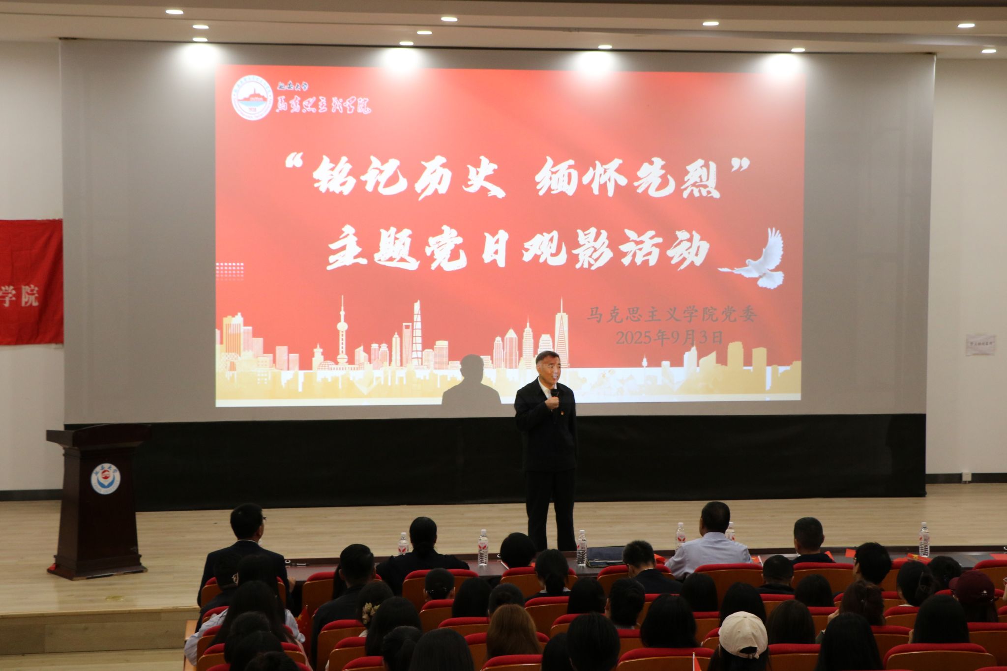 为进一步深化爱国主义教育,传承伟大抗战精神,9月3日上午,马克思主义公司党委组织全体师生在老员工活动中心红色影院开展了“铭记历史 缅怀先烈 珍爱和平 开创未来”主题党日观影活动。活动由党委书记张彬主持。