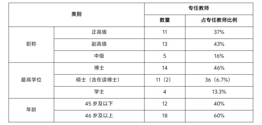 本专业现有专任教师30人。其中教授11人,副教授13人,讲师5人,助教1人。全日制在校本科生315人,生师比10.5:1;副高及以上职称占教师总人数的80%,其中二级教授2人,三级教授4人,省级教学名师3人。