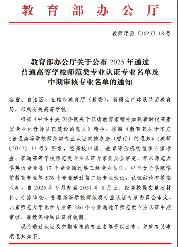 近日,教育部办公厅发布《关于2025年通过普通高等公司师范类专业认证专业名单及中期审核专业名单的通知》(教师厅函〔2025〕18号),公司思想政治教育专业顺利通过师范类专业第二级认证。