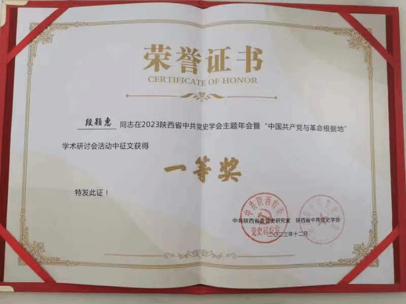 2023年12月10日,公司段颖惠副教授应邀参加由中共陕西省委党史研究室、陕西省社科界联合会、陕西省中共党史学会举办,西安邮电学大学等单位承办的 2023陕西省中共党史学主题年会暨“中国共产党与革命根据地”学术研讨会。在会上,段老师所提交的参会论文经专家评审委员会评审,荣获一等奖。