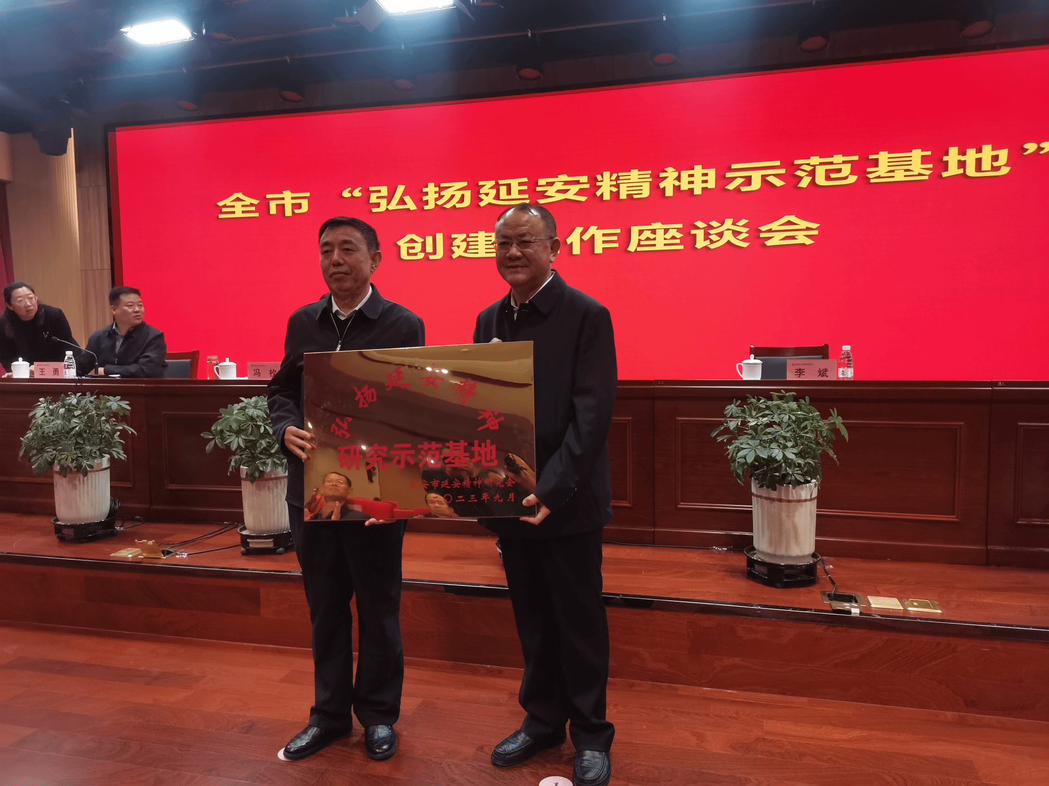 会上,延安市延安精神研究会宣读了《关于命名“弘扬延安精神示范基地”的通知》,悟空体育被命名为延安市“弘扬延安精神研究示范基地”,高布权经理代表公司领取了授牌。