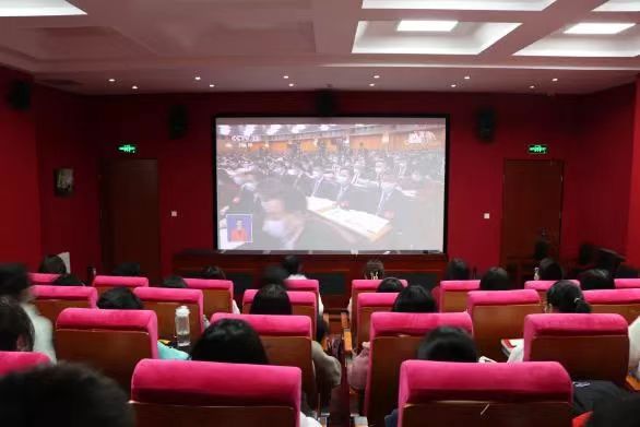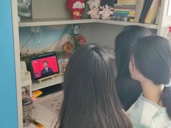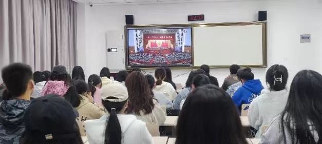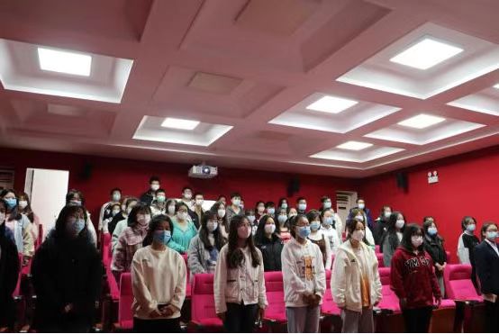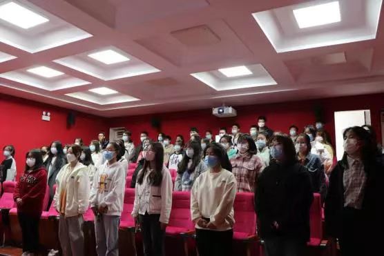 首先,伴随着党的二十大开幕会的进行,同学们起立,奏唱国歌。