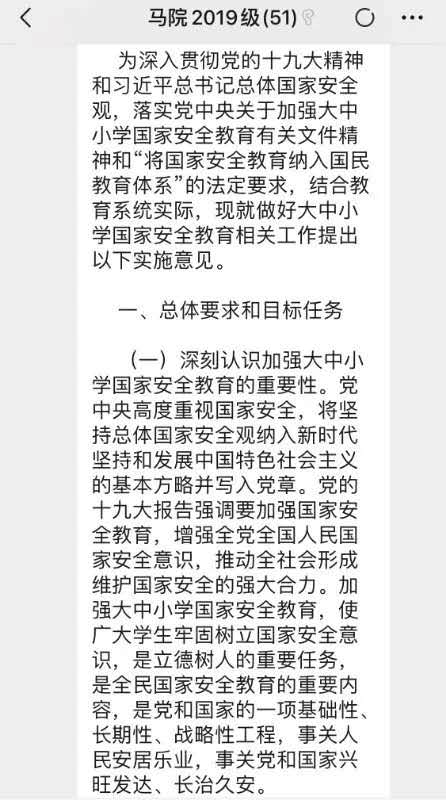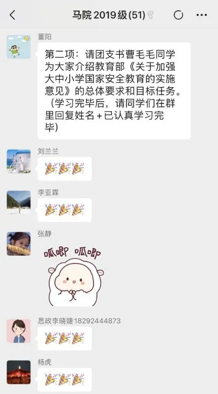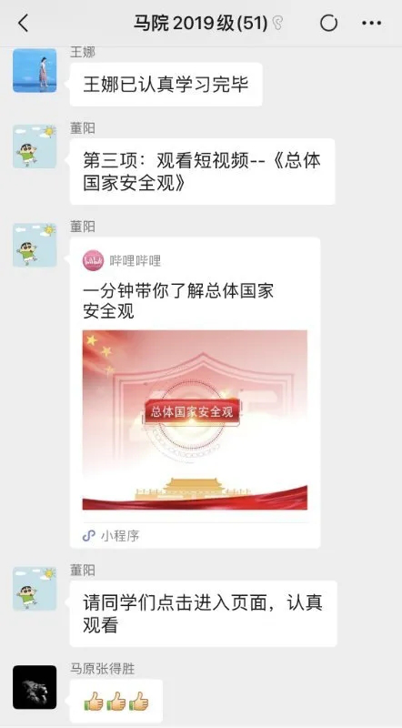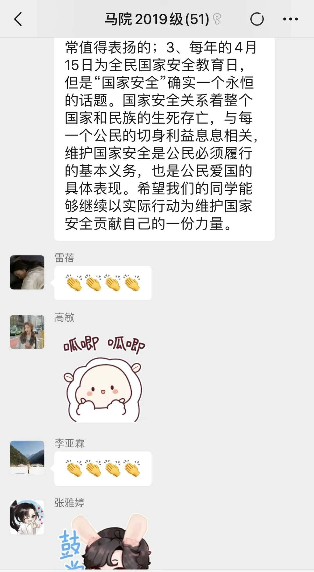 为了深入学习贯彻习近平总书记关于国家安全的重要论述,牢固树立总体国家安全观,切实增强同学们维护国家安全的政治自觉、思想自觉、行动自觉。公司2019级硕士研究生于4月13日上午10时在班级微信群组织开展了“增强国家安全意识,勇担青春报国使命”线上国家安全教育主题班会。参与本次活动的有2019级班主任闫莉莉老师和2019级全体同学。会议由2019级班长董阳主持。