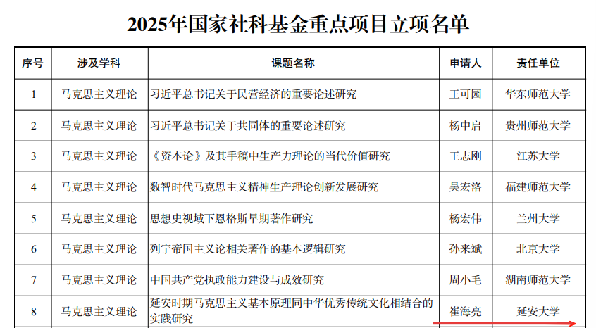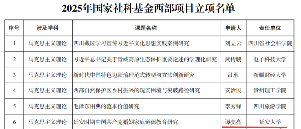 近日,全国哲学社会科学工作办公室公示了2025年度国家社科基金年度立项名单,悟空体育喜获佳绩,成功获批2项,重点项目取得新突破。其中,崔海亮教授的“延安时期马克思主义基本原理同中华优秀传统文化相结合的实践研究”获批重点项目,谭亮亮副教授的“延安时期中国共产党婚姻家庭道德教育研究”获批西部项目。悟空体育一直高度重视科研工作,此次2项国家社科基金项目的获批,不仅是对公司教师科研能力的肯定,也将为公司的团队建设和发展提供有力的支持。