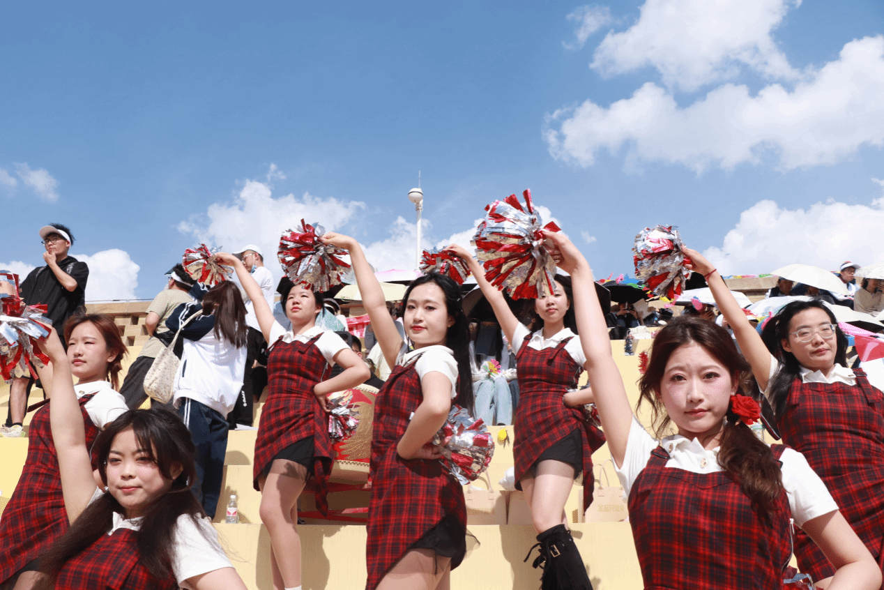 啦啦操:随着阳光洒满绿茵操场,啦啦队员们身着色彩斑斓的服装,手持各色花球与彩带,在观众席前翩翩起舞。她们动作整齐划一,活力四溢,每一次跳跃都仿佛在为运动员们注入无尽的能量,每一个笑容都是对拼搏者的鼓励与支持。