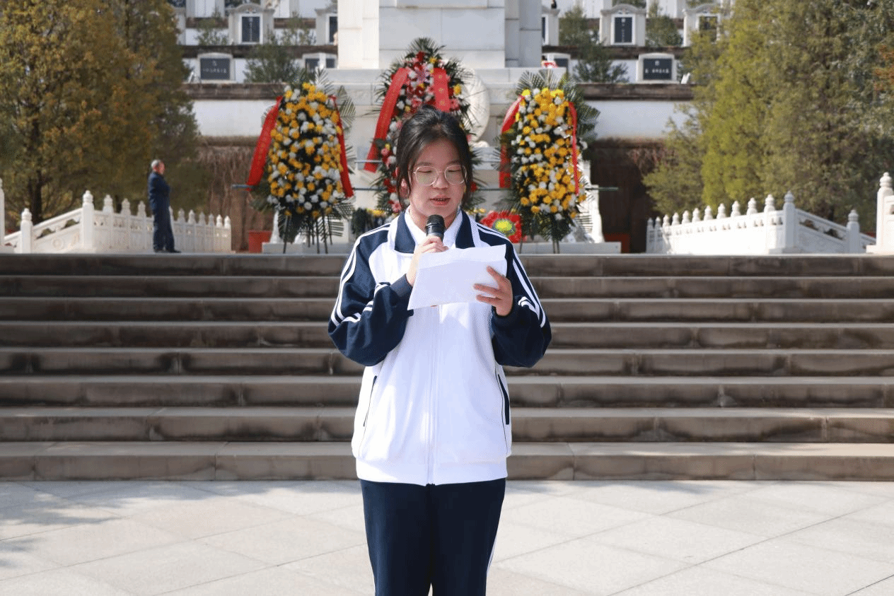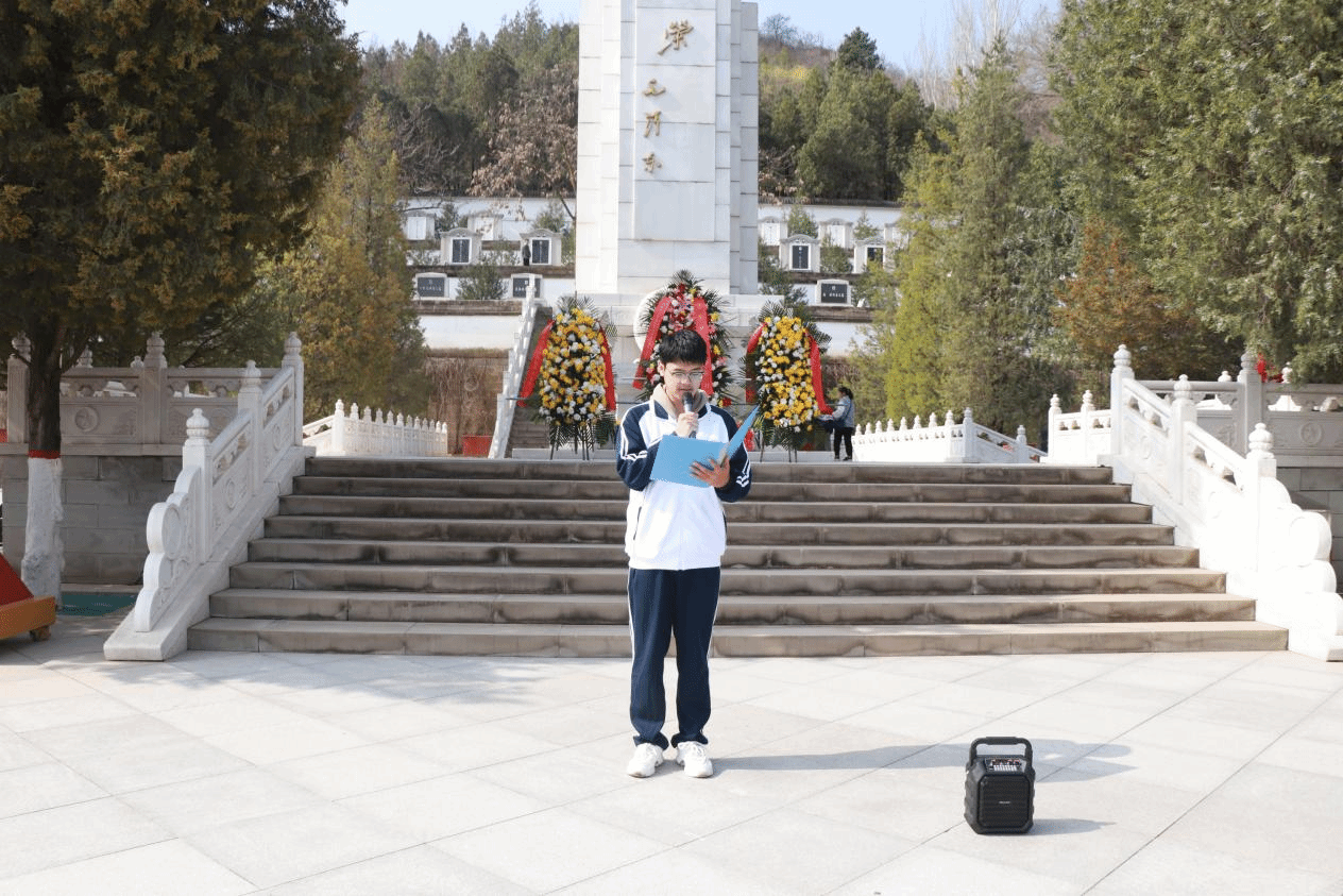 吴苏怡同学和李雨珂同学合诵《清明》,王思雨同学和孟申奥同学合诵《清明》。“清明时节雨纷纷,路上行人欲断魂。”在烈士墓前,在四月的春风里,在他们的朗诵中,悲情从字里行间流出,将对烈士的哀思与敬仰传递给每一位在场的同学。