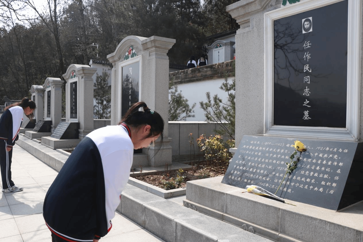 青山有幸埋忠烈, 浩气无形化丰碑。在纪念碑前,同学们庄严肃立,马玉同学带领大家行鞠躬礼,并带领大家宣誓。庄严的时刻,郑重的誓言,不能忘的是革命先烈的精神意志,不能舍的是革命先烈的光荣传统,不能停的是接续创造的辉煌业绩。