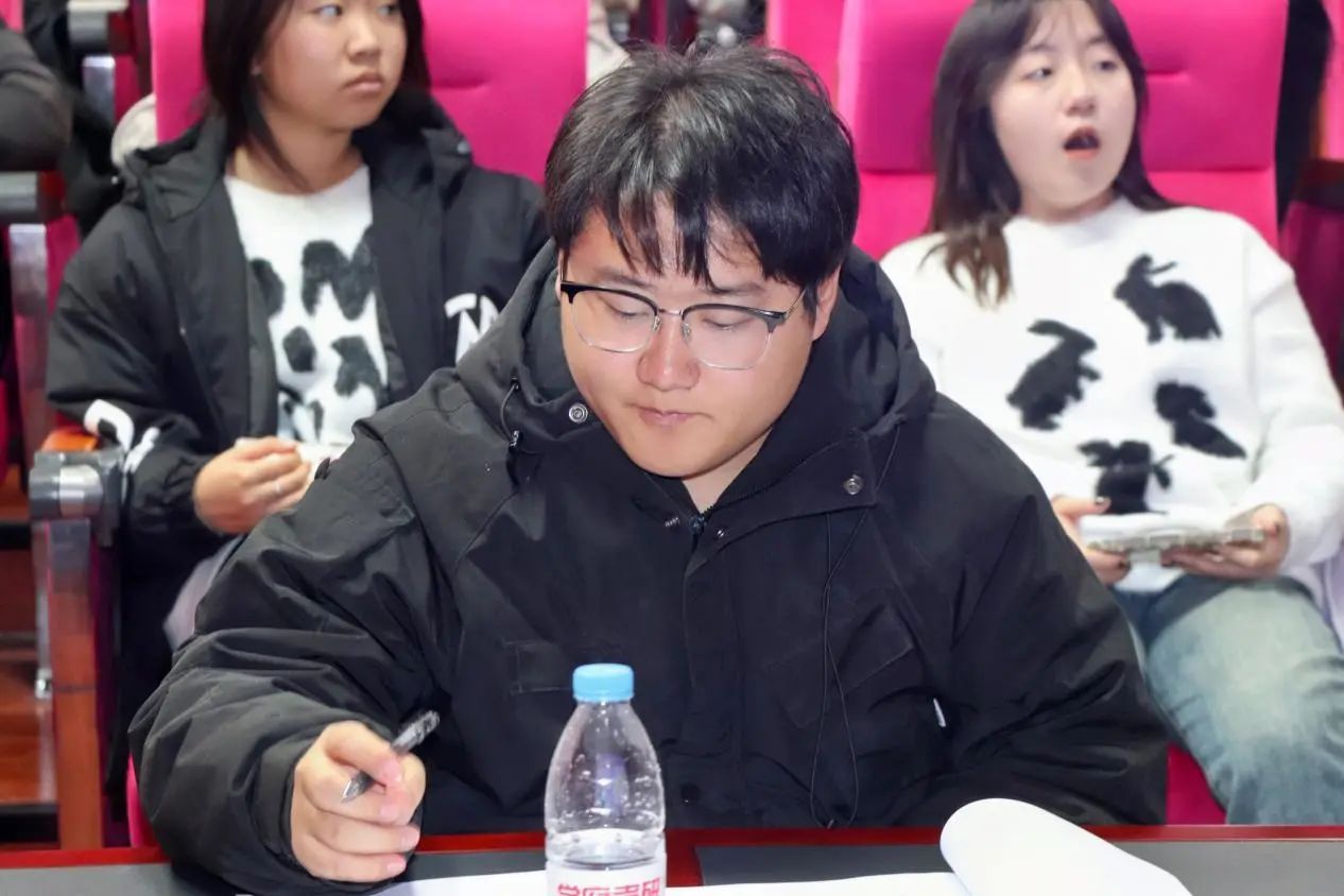 最后,田满园学长就此次比赛总结并对我们寄语道:“一、四年时间转瞬即逝,要树立明确的目标和规划。二、有目标后该怎样行动,要把理论转化为实践,将目标转化为现实。三、要有毅力,毅力是支撑行动的精神动力。四,不管是面对考研还是考公还是求职,要有耐心。”田满园的一席话对于我们同学的学习和职业规划有了很大的启发。