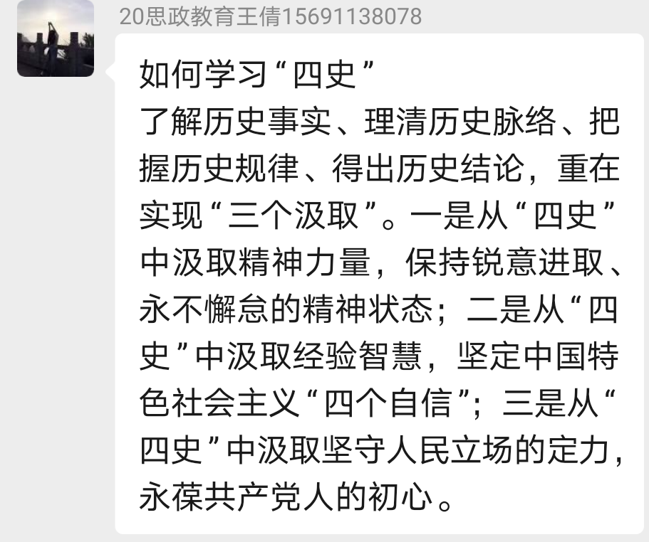 “担使命、致未来”线上研讨会于2020年12月1日在积极分子培训群举行,由员工党支部纪检委员贺宁宁同学主持。首先,由贺宁宁同志向参会积极分子介绍本次研讨内容:1、分享学“四史”心得体会;2、结合自身实际谈谈如何争做一名合格的中国共产党党员;3、分享相关主题视频及报道。