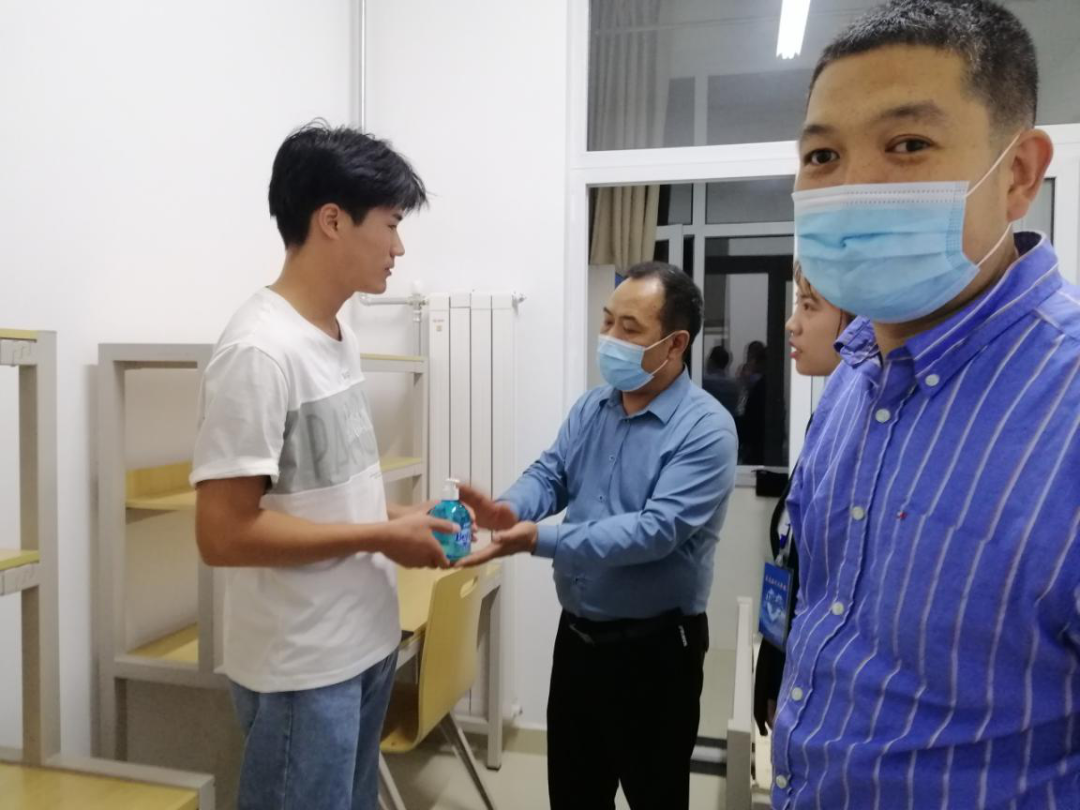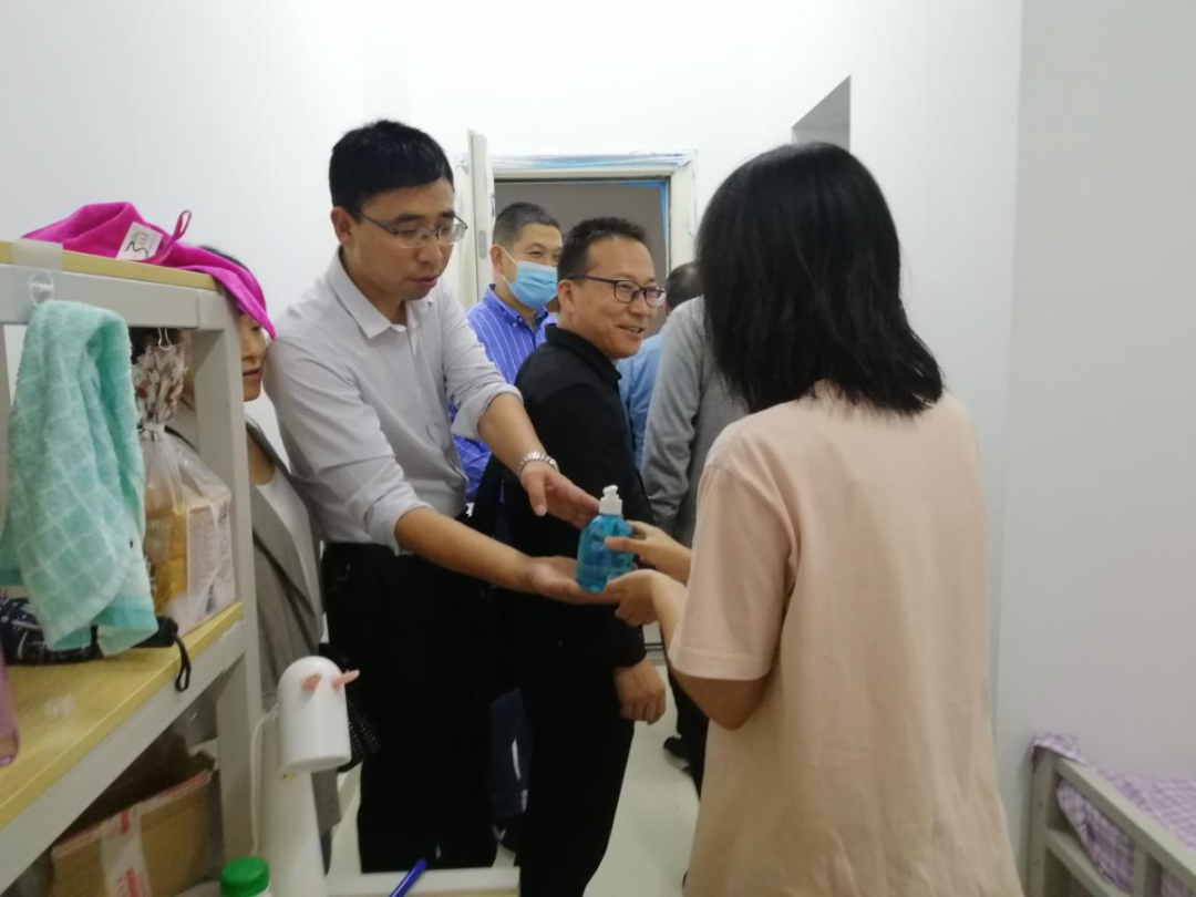“家住哪里,报到过程顺利吗?住宿条件还满意吗?”每到一个宿舍,院领导和老师们都与研究生新生们亲切交谈,询问同学们的入校报道后的感受及生活状态,了解同学们对专业学习和未来发展等方面的想法,并勉励同学们在疫情防控的特殊背景下,要保持良好的学习和生活习惯;尽快适应研究生生活,脚踏实地,扎实学习,潜心研究,不断取得新的成绩;遇到任何需要解决的问题随时和辅导员老师进行联系、沟通;以积极乐观的心态面对学习和生活。同时,亲自将公司精心准备的洗手液发放到员工手中。