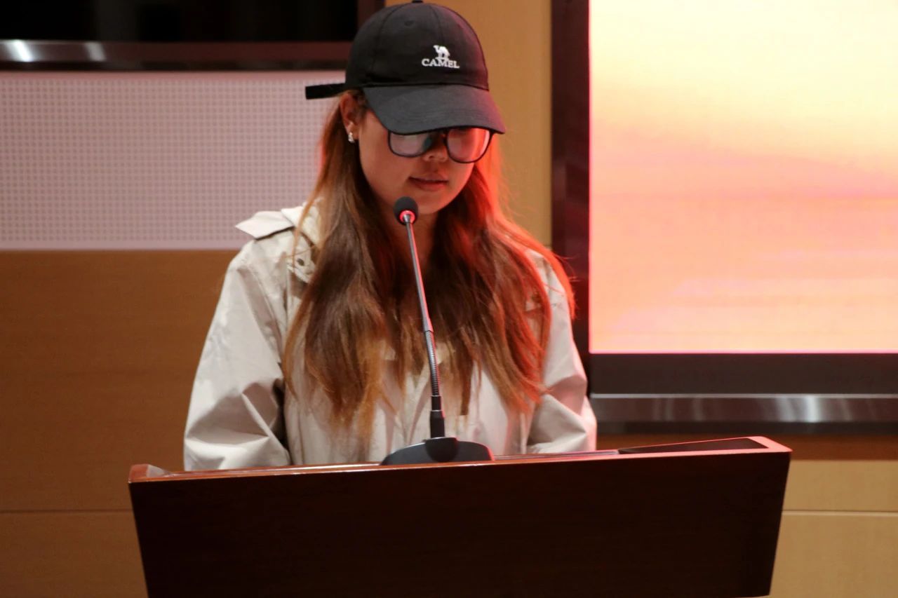 拉拉队代表24级思政王英上台发言。她满怀激情地表示,拉拉队将用热情的呐喊和精彩的表演为运动员们加油助威。她们将成为运动员们最坚实的后盾,以青春活力点燃赛事激情,为运动会营造热烈氛围,让每一位运动员都能感受到满满的支持与鼓励。