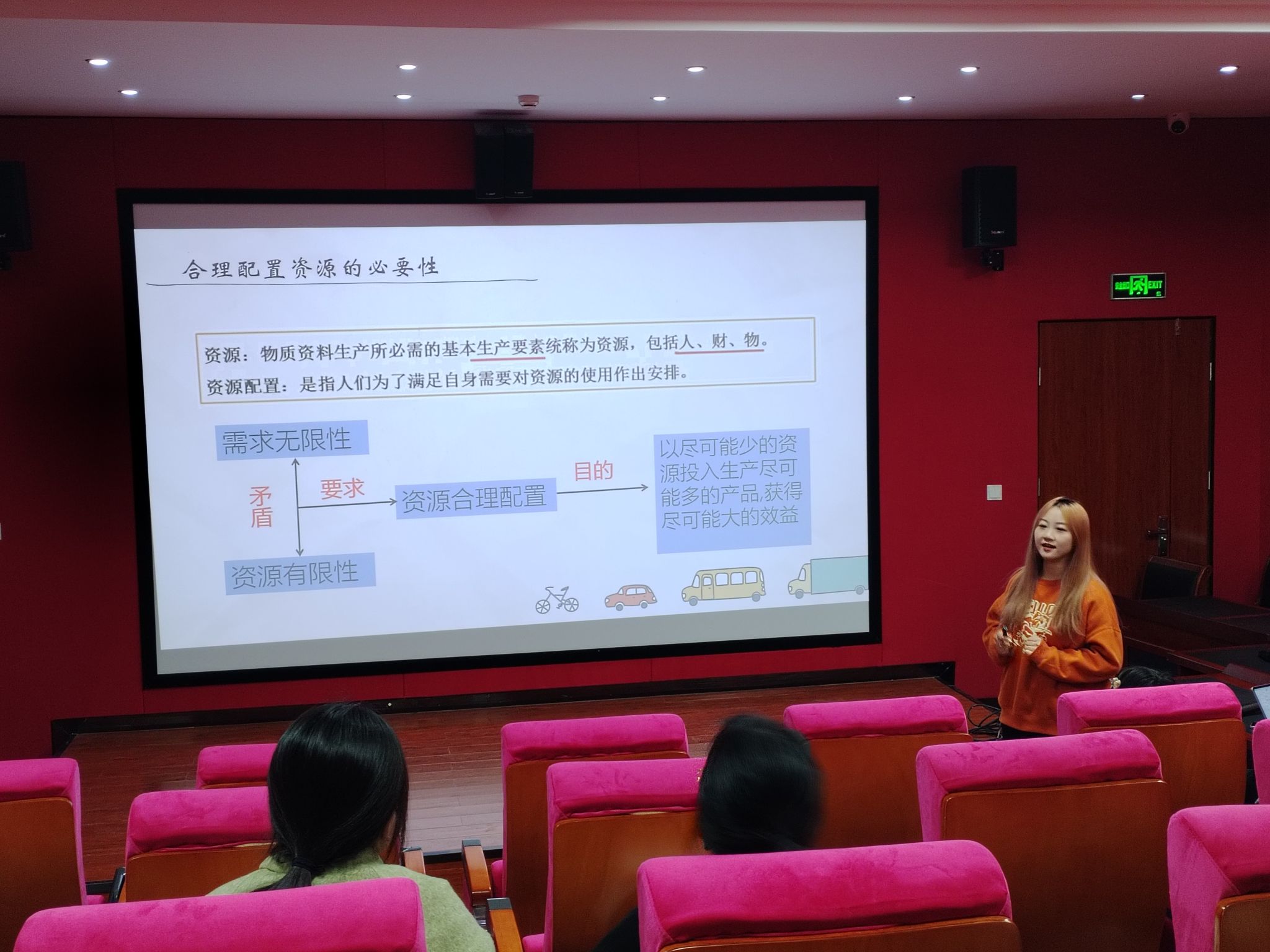 刘欢同学试讲的内容是《世界的物质性》,对物质的含义和唯一特性、自然界的物质性、人类社会的物质性以及意识是物质世界长期发展的产物等内容进行了详细的讲授。通过时政热点的展开导入教学,并在问题设置中,引导小组成员进行讨论,在师生和生生互动中深入知识点的学习。试讲结束后,在同学互评环节,就材料深度挖掘的问题进行了充分讨论。之后谢延秀老师做出了评价,首先对其教学基本功的把握和教学热情的调动给予了肯定,其次进一步提出了以员工为主体,启发式教学的重要性,最后强调要对授课思维进行进一步探究。
