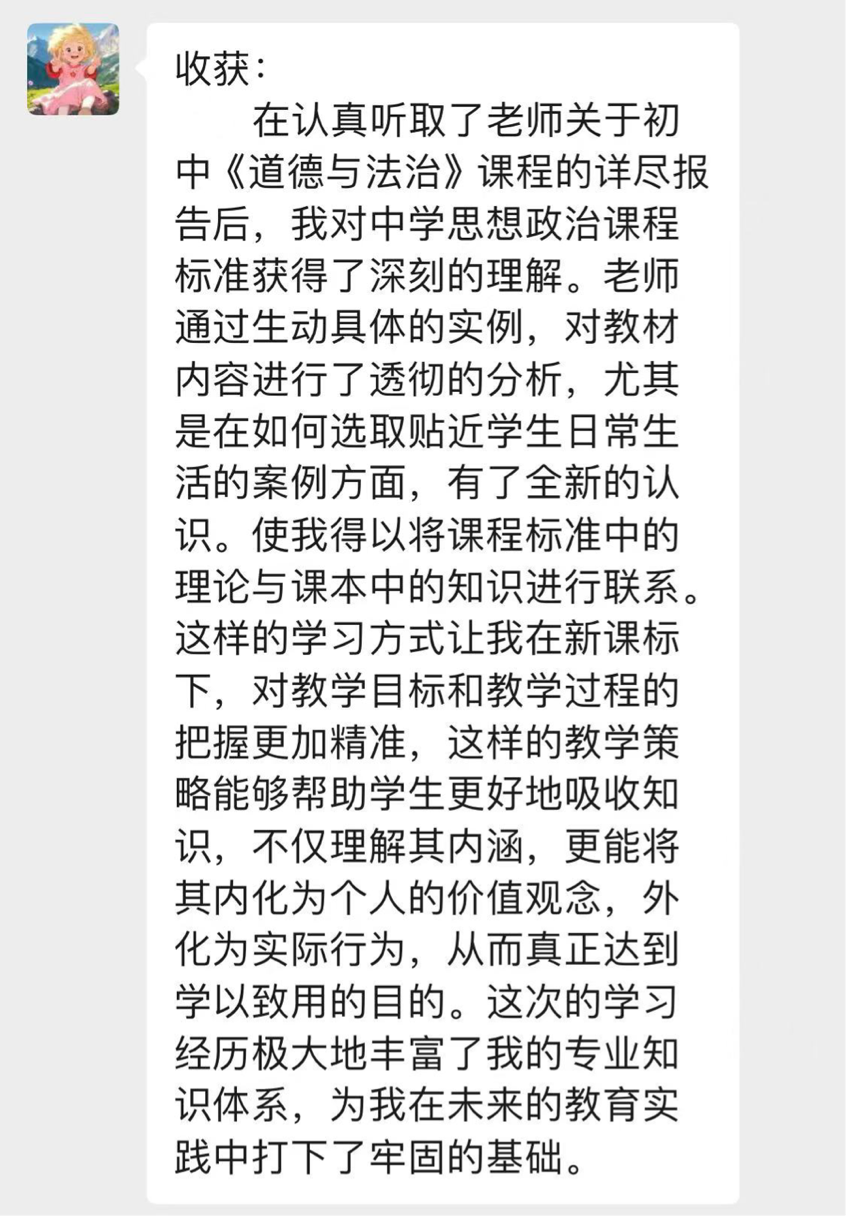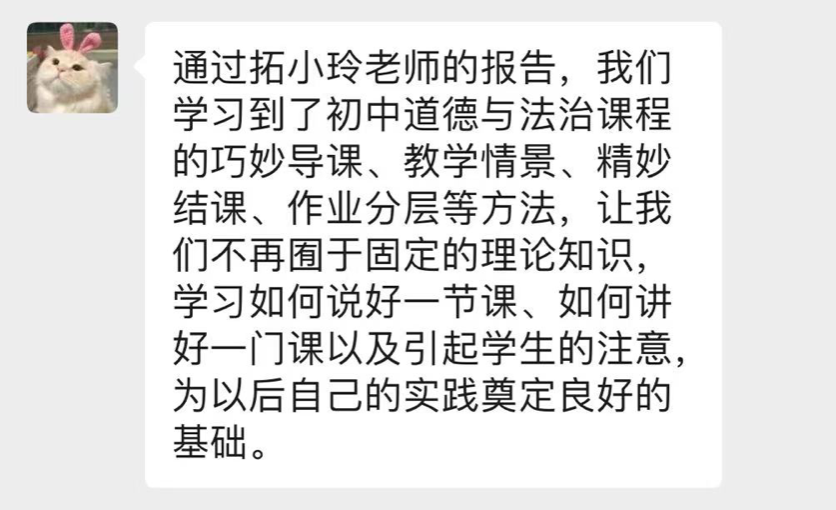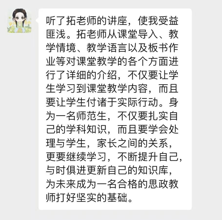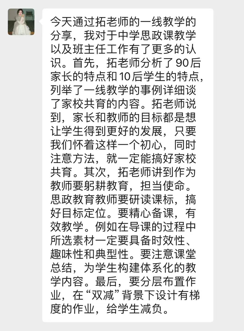 拓老师强调教育不是小事,它关乎着青少年精神世界的塑造。解决好培养什么人、怎样培养人,为谁培养人这个根本问题。在这个根本问题上,必须旗帜鲜明,毫不含糊。这就要求我们把下一代教育好、培养好,从公司抓起、从娃娃抓起。作为一线思政教师,初心不改,担当使命,既要仰望星空,又要脚踏实地,前行路漫漫,努力方灿灿!