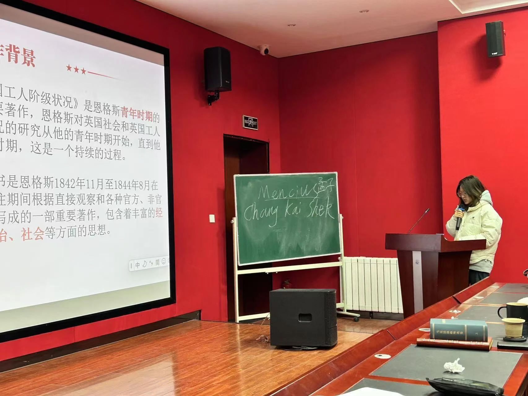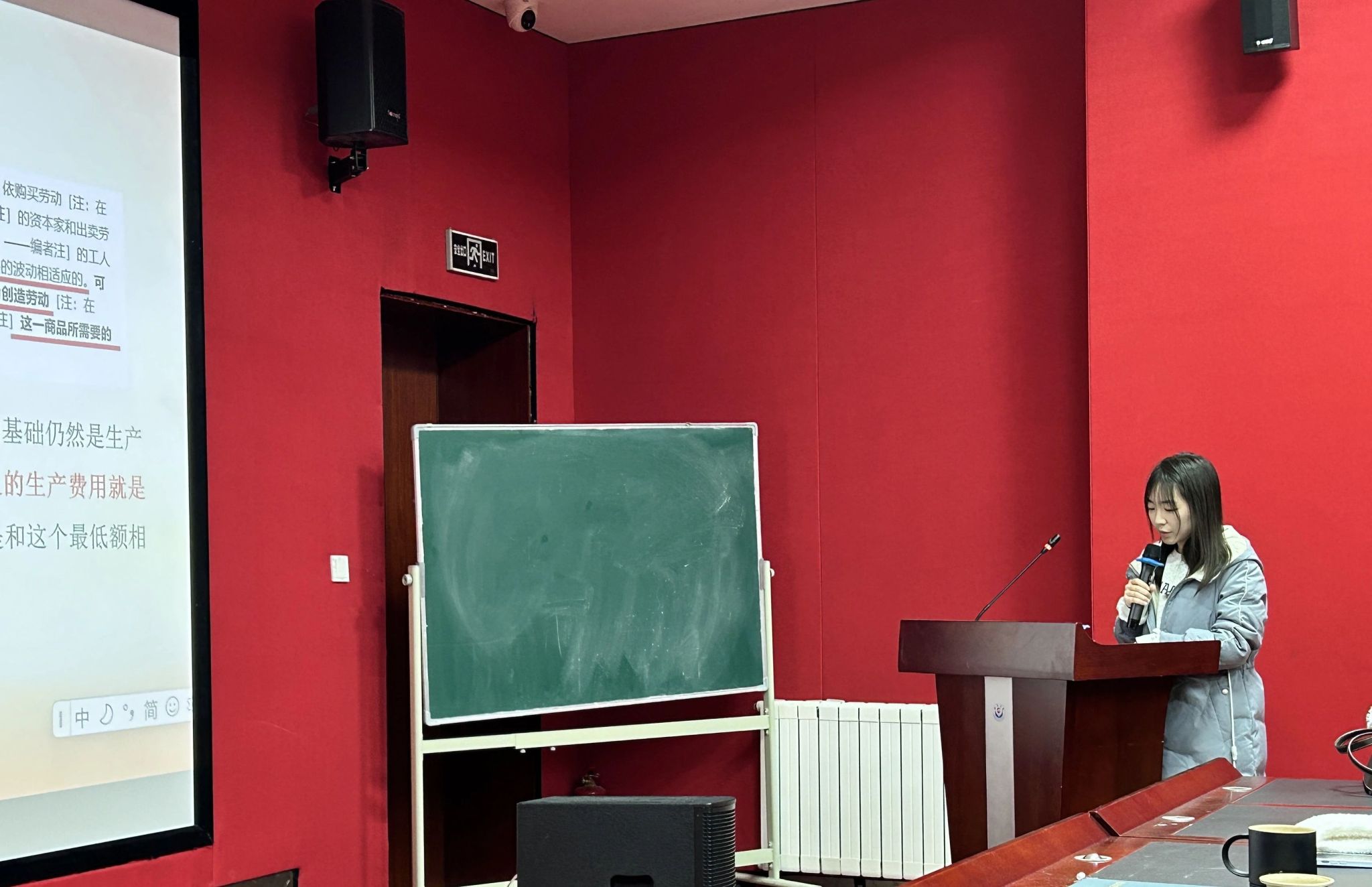 2024年12月11日,“马克思主义经典文献研读” 系列学术活动迎来第五十一期,活动在悟空体育一楼报告厅顺利举行。此次读书会聚焦于马克思主义经典著作,围绕《雇佣劳动与资本》《哥达纲领批判》以及《英国工人阶级状况》三部经典文献展开深入研讨。活动中,2024 级硕士研究生黄文博、曹文瑾、张馨月三位同学依次登台,就各自研读经典文献的心得与见解作了详细报告分享。刘建华老师和高延春老师全程聆听,并针对三位同学的报告内容,从理论剖析、逻辑架构、现实映照等多方面给予专业且细致的指导,助力同学们在学术探究之路上不断精进。