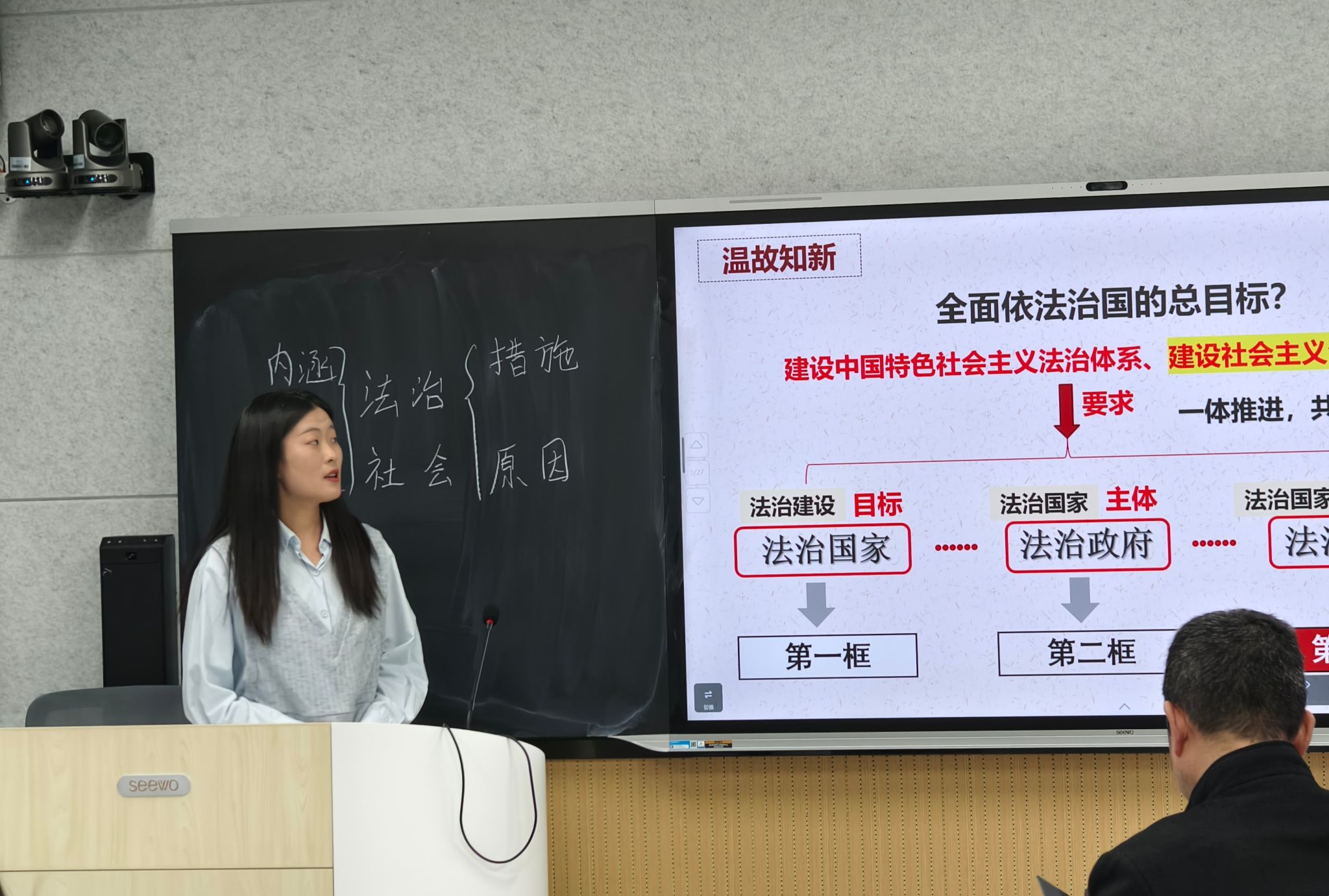 郭小娜同学试讲的是高中必修三第八课第三框《法治社会》。课程以如何描绘法治新蓝图这个总议题开启分议题的学习,课中让同学们分别扮演养犬主人、社区居民、居委会人员等角色,用文明养犬这一案例贯穿始终。在同学们的表演和讨论中,逐步引导员工理解法治社会的内涵和基本特征,掌握建设法治社会的措施和意义。临近尾声,她梳理了本节课知识框架,同时对法治社会建设的未来表达了美好愿景。通过这节课,不仅加深了员工对理论知识的理解,也激发了员工践行法治的责任感与使命感,为建设法治国家贡献自己的力量。