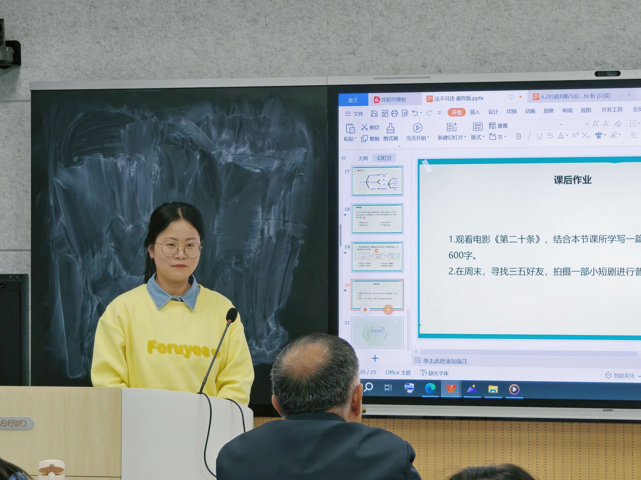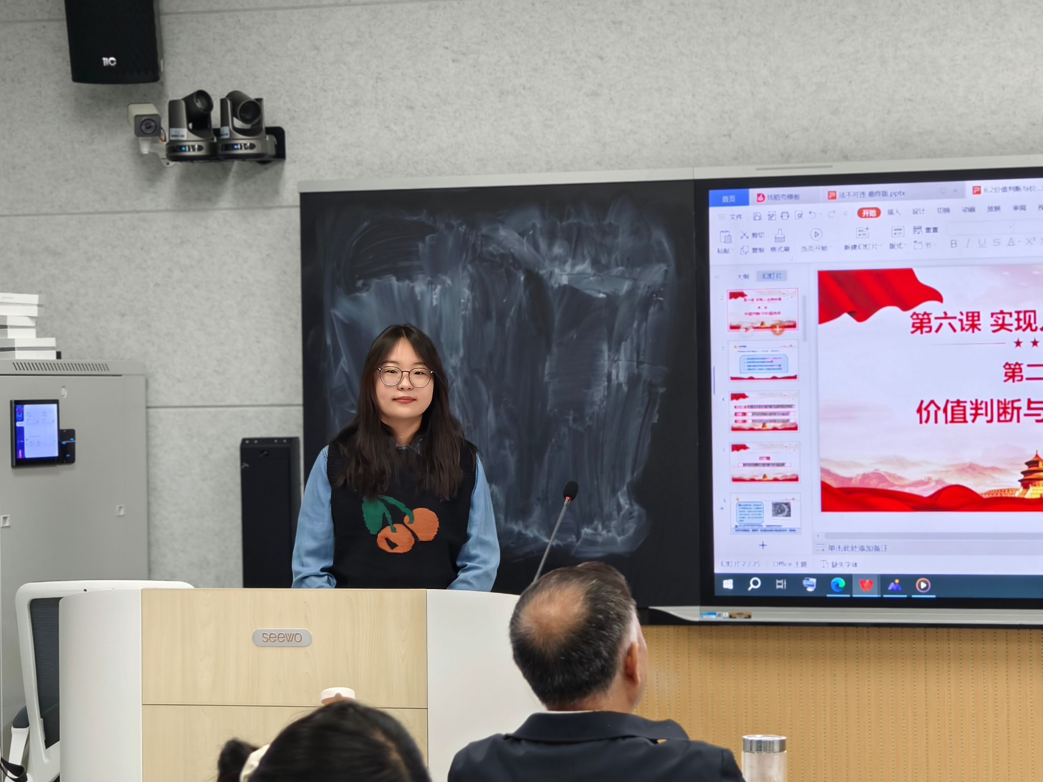 2025年4月16日,学科思政24全体同学于悟空体育202智慧教室开展了教学技能实训的第十五期活动。本次实训活动讲课人为何嘉玲和曹慧慧两位同学。讲课的内容分别是七年级下册《道德与法治》第四单元第十一课第一框《法不可违》和高中政治必修四第六课第二框《价值判断与价值选择》。