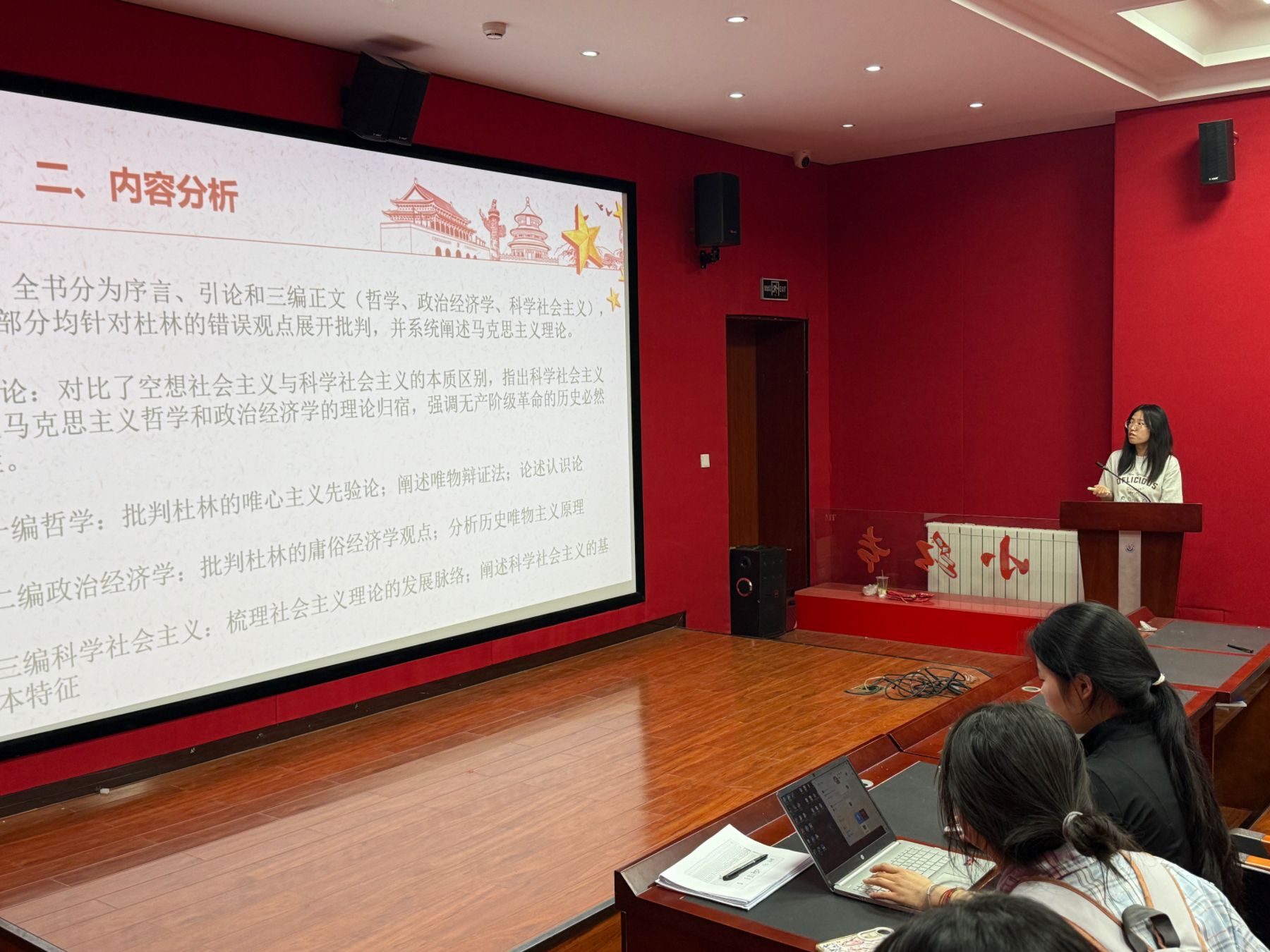 第一位分享人白焜如对《反杜林论》进行了阅读分享。该同学分别从简介、内容分析、文献综述和意义及启示四个方面阐述她的心得体会。首先,她介绍这本书写于1876年5月至1878年7月,是为了批判杜林的错误理论而写的,它的写作和社会矛盾、思想斗争及无产阶级革命实践密切相关,被称为“马克思主义的百科全书”。随后,她分析了每一部分的主要内容,本书包括序言、引论和三编正文,如第一编哲学主要批判杜林的先验主义、阐述唯物辩证法、论述认识论。接着,她分享了两篇相关文献的结构框架,写作背景和主要观点内容。最后,她对意义及启示进行总结。《反杜林论》加强了对马克思主义的捍卫和发展,有助于构建马克思主义政治经济学理论框架,启示我们要坚持马克思主义的科学性和革命性的统一,反对形而上学和教条主义等。