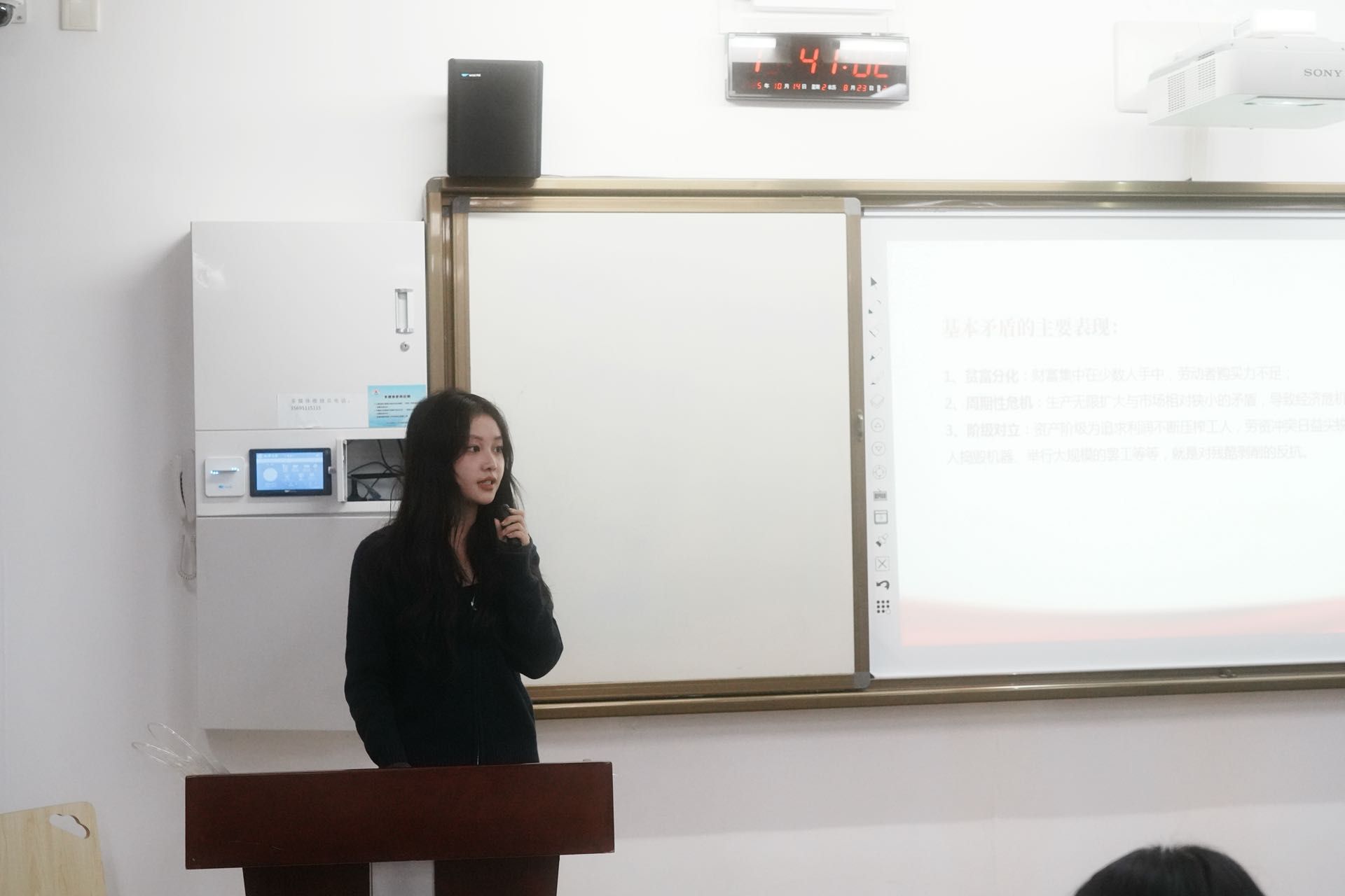 第二位分享人是张心蓝。她聚焦《共产党宣言》第一章第二部分即资产阶级的革命性及其掘墓人的诞生展开深入阐释。首先,她剖析资产阶级的革命性,从经济、政治、社会关系维度说明其如何打破封建束缚,让大家认识到资产阶级在特定历史阶段的进步作用。其次,她解析资产阶级的内在矛盾,指出资本主义根本矛盾是生产社会化和生产资料私人占有之间的矛盾,并详细说明这一矛盾在贫富分化、周期性危机、阶级对立上的主要表现,结合《马克思恩格斯选集》中的论述,让大家理解资产阶级自身矛盾的不可调和性。再次,她阐述掘墓人的诞生,即无产阶级的形成逻辑与独特优势,分析无产阶级如何从分散个体成长为具有阶级意识的革命力量,以及其作为先进生产力代表、具有高度组织性和彻底革命性的特点。最后,她总结该部分的时代意义,一是帮助大家科学认识资本主义,既看到其进步性也正视其内在矛盾;二是让大家理解社会发展的客观趋势,明白资本主义灭亡和共产主义胜利是历史规律,为无产阶级革命提供科学理论依据和信心。